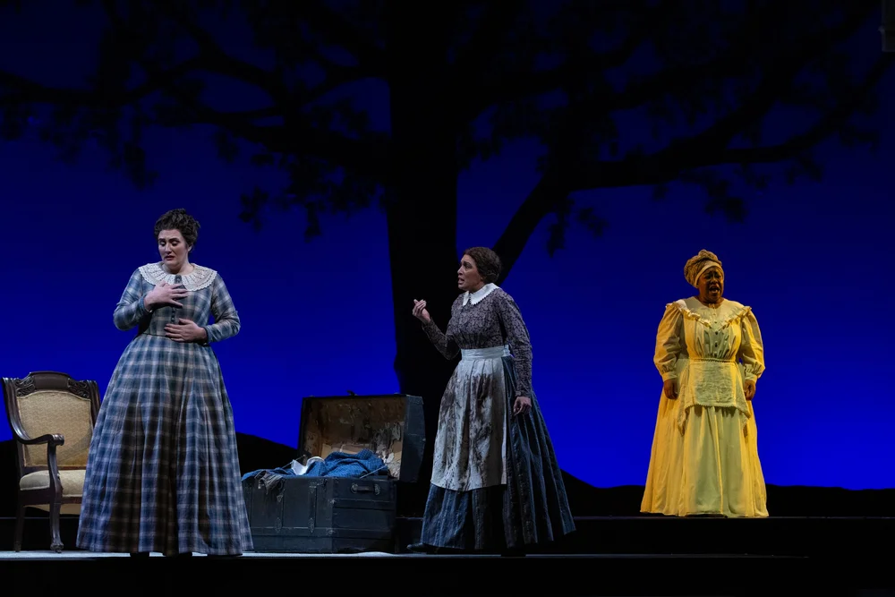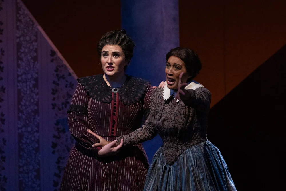 The confrontation between Elizabeth (Ashley Dixon) and Mary Jane (Jacqueline Echols McCarley) with Lucinda (Cierra Byrd) standing by. Picture by Dave Pearson Pictures; courtesy of Virginia Opera.
