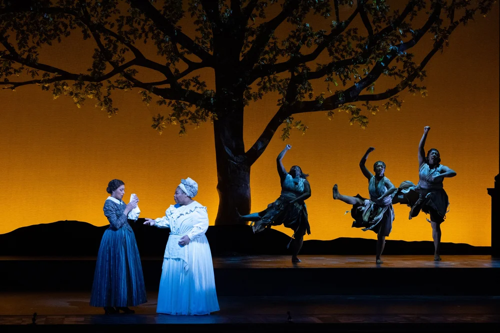 Mary Jane (Jacqueline Echols McCarley) confronts her heritage with Lucinda (Cierra Byrd) and dancers Noelani Corey-Barr, Amaya Weston, and Christine C. Wyatt. Picture by Dave Pearson Pictures; courtesy of Virginia Opera.