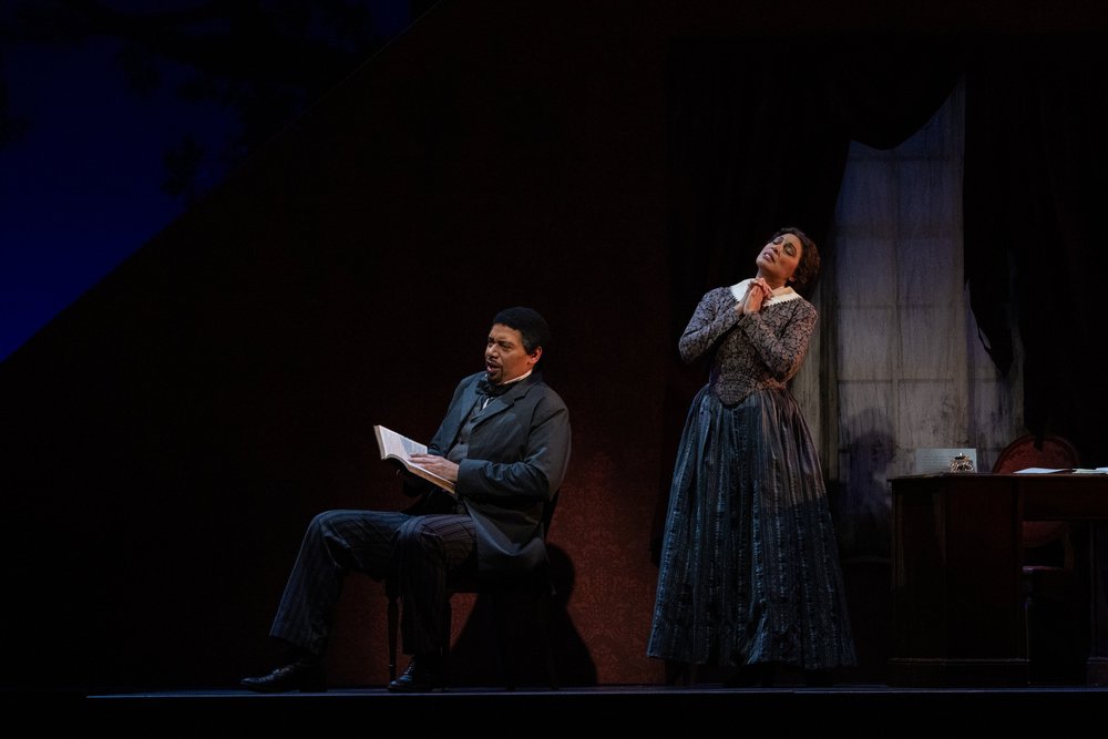 Butler Henry (Kevin Thompson) reads to Mary Jane (Jacqueline Echols McCarley) who claims to be illiterate. Picture by Dave Pearson Pictures; courtesy of Virginia Opera.